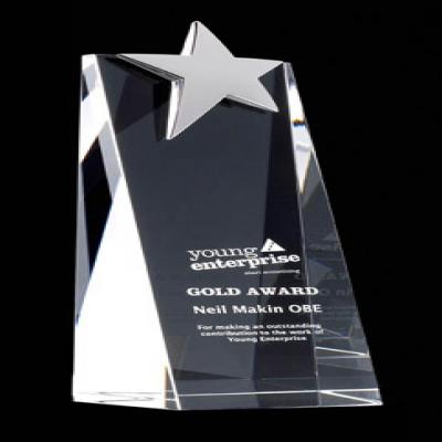 Large crystal star wedge award with silver chrome star 215mm high supplied in a satin lined gift box